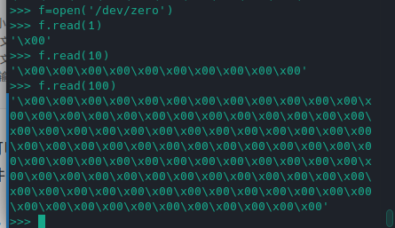 注意:read中参数表示一次读取多少字节数据,如果你不传入参数,即使用默认参数-1,就表示一次性完整读取整个文件并加载到内存中,然而/dev/zero是逻辑上的文件,拥有无限大小,永远也读不完。所以,如果你直接使用f.read()那么你可以看到电脑内存将飙升,直到内存不足死机。[doge]